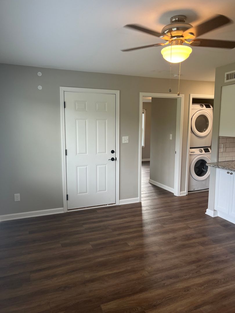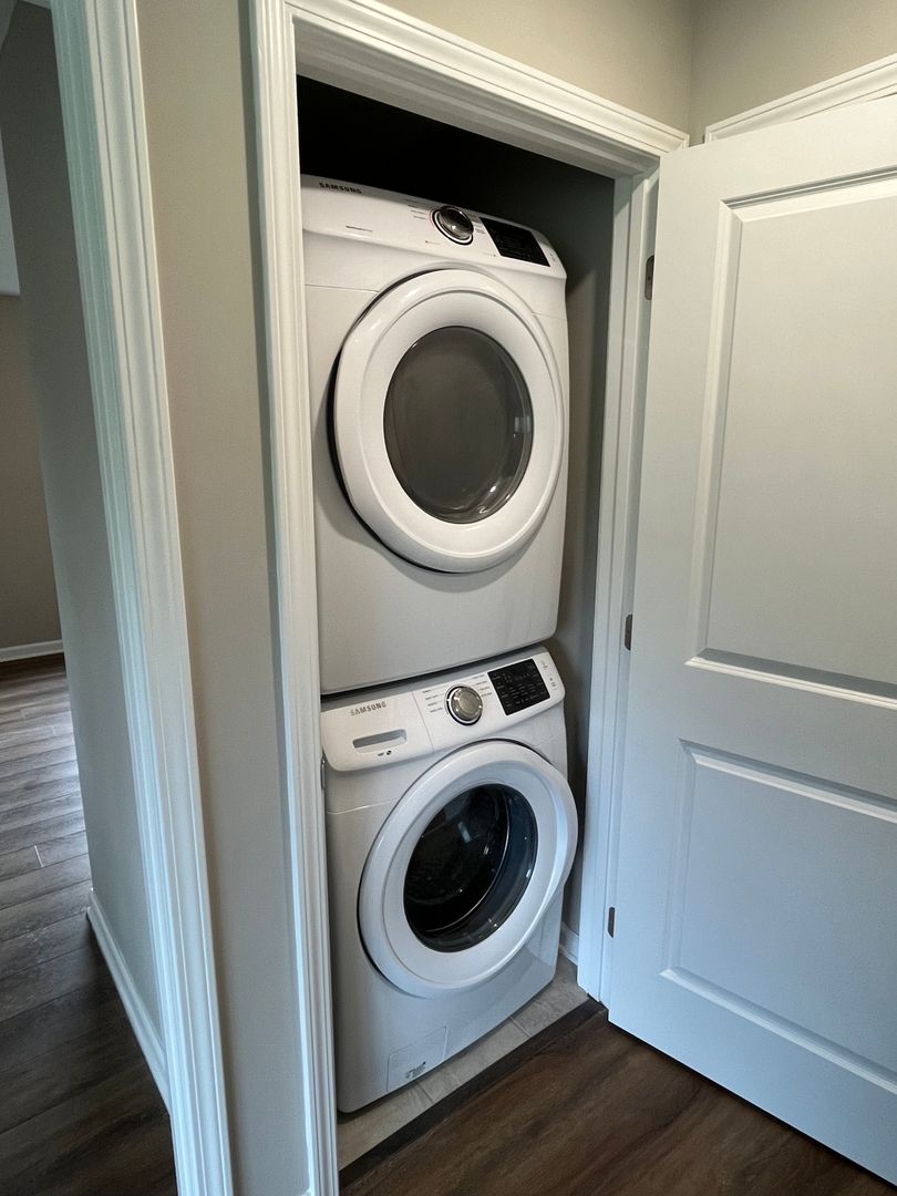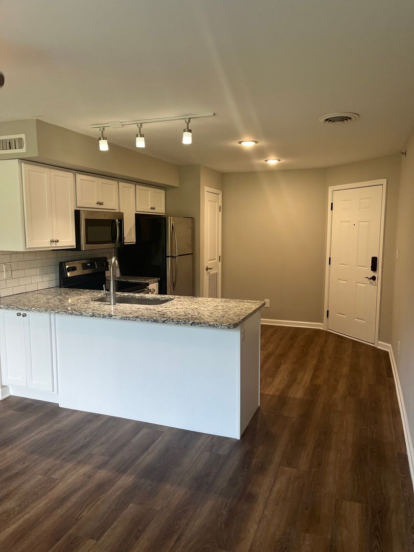 Unit includes stove, refrigerator, microwave, dishwasher, front loader washer & dryer. Granite countertops, waterproof vinyl flooring throughout unit, tile in bathroom. Unit has a private balcony which overlooks a beautiful (and quiet) landscape.