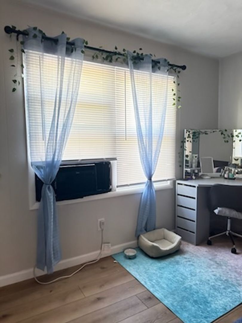 Unit has large living room with half bath, eat in kitchen with private patio space. Upstairs there are 2 bedrooms and a master bath. Radiant ceiling heat, no AC (window units allowed).